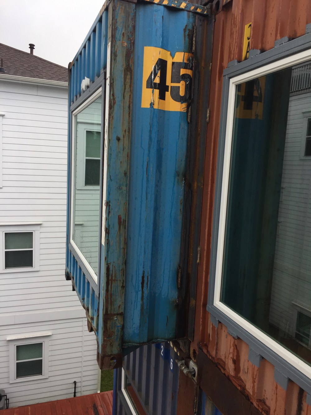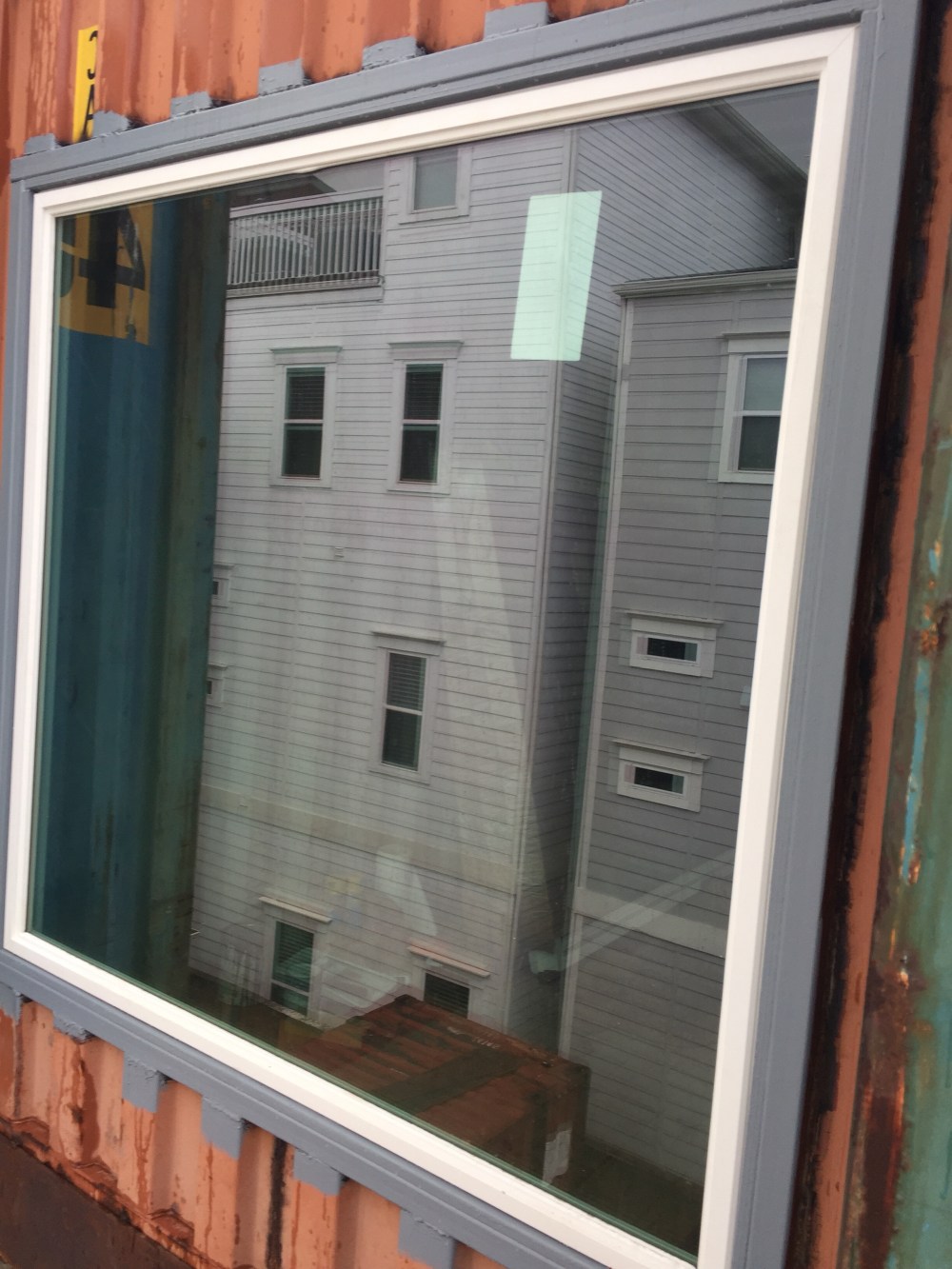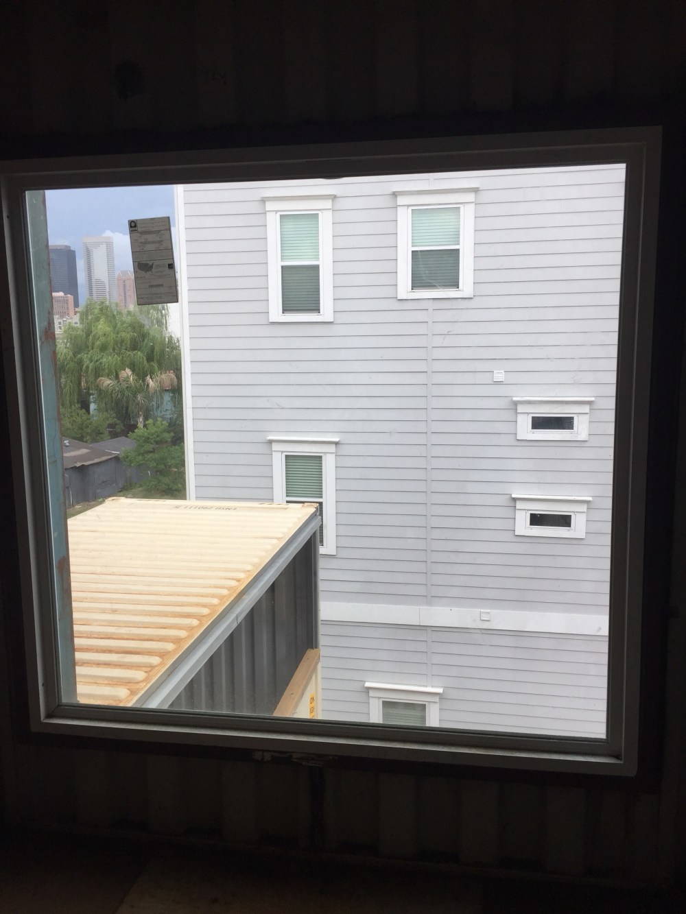 The third floor windows are also in. They were a big challenge because the steel framing does not give and the windows are very large, so it all has to be perfect to go in correctly. At about 6′ x 7′ and double paned, laminated, they are very heavy. I’m actually a little surprised I was able to get them installed by myself. The trim I installed ahead of time made it possible. They still need to be sealed, but at least they are in and help keep the rain out.