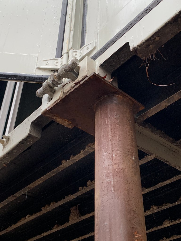 The weather was pretty poor the week after the containers were set. Fortunately I was able to get the bridge clamps installed, even in the rain. These add to the structural integrity of the project. Clamps like these are what keeps the containers from toppling when the ships have run aground carrying these stacked 8 high. In the highly unlikely event of a pier failure, the clamps would keep the structure attached to itself. Lots of people weld the containers together and I did that too on my Houston house. But the structural engineer specified these as the primary method for securing them to each other because if it is good enough when the containers are fully loaded and stacked 8 tall, it is good enough for a two story house.