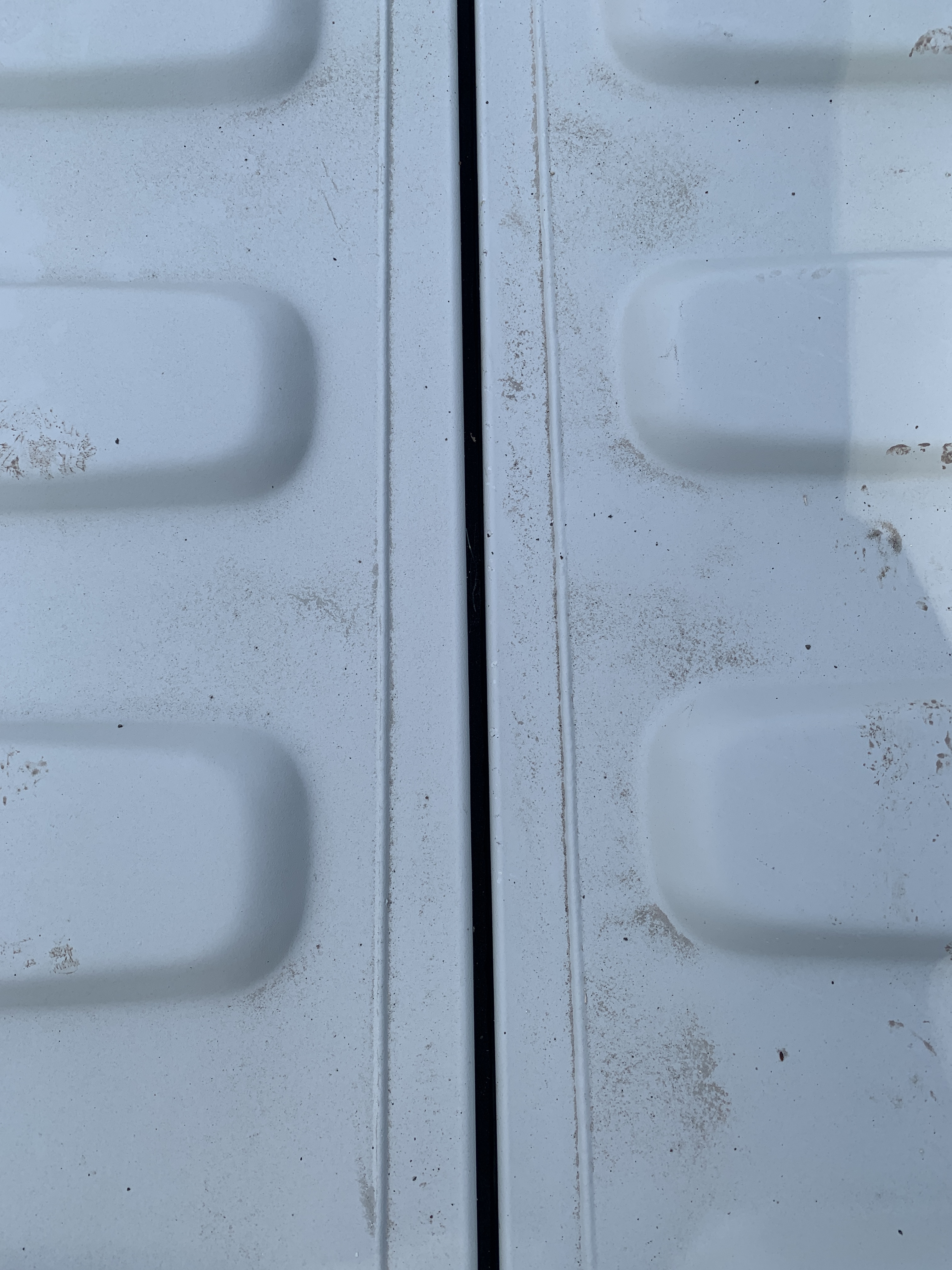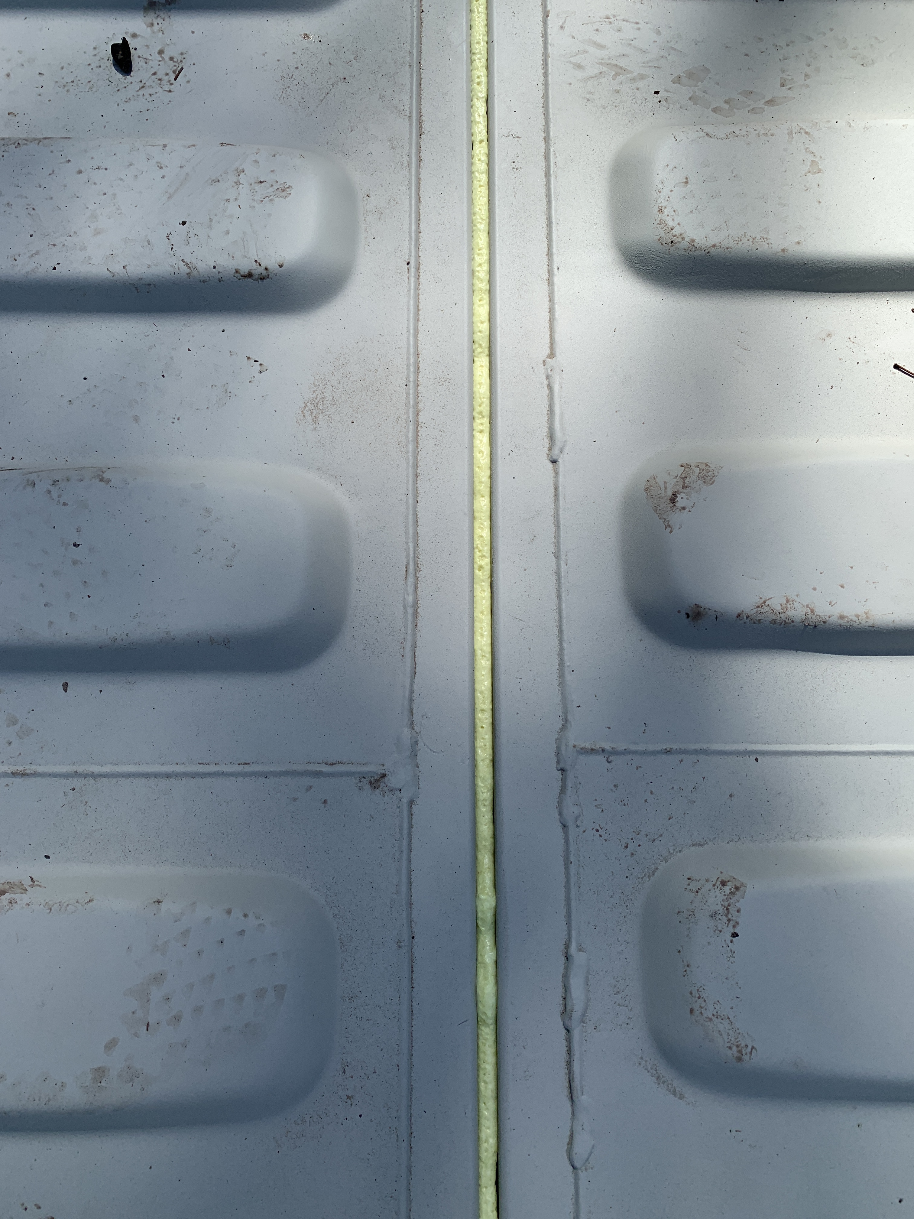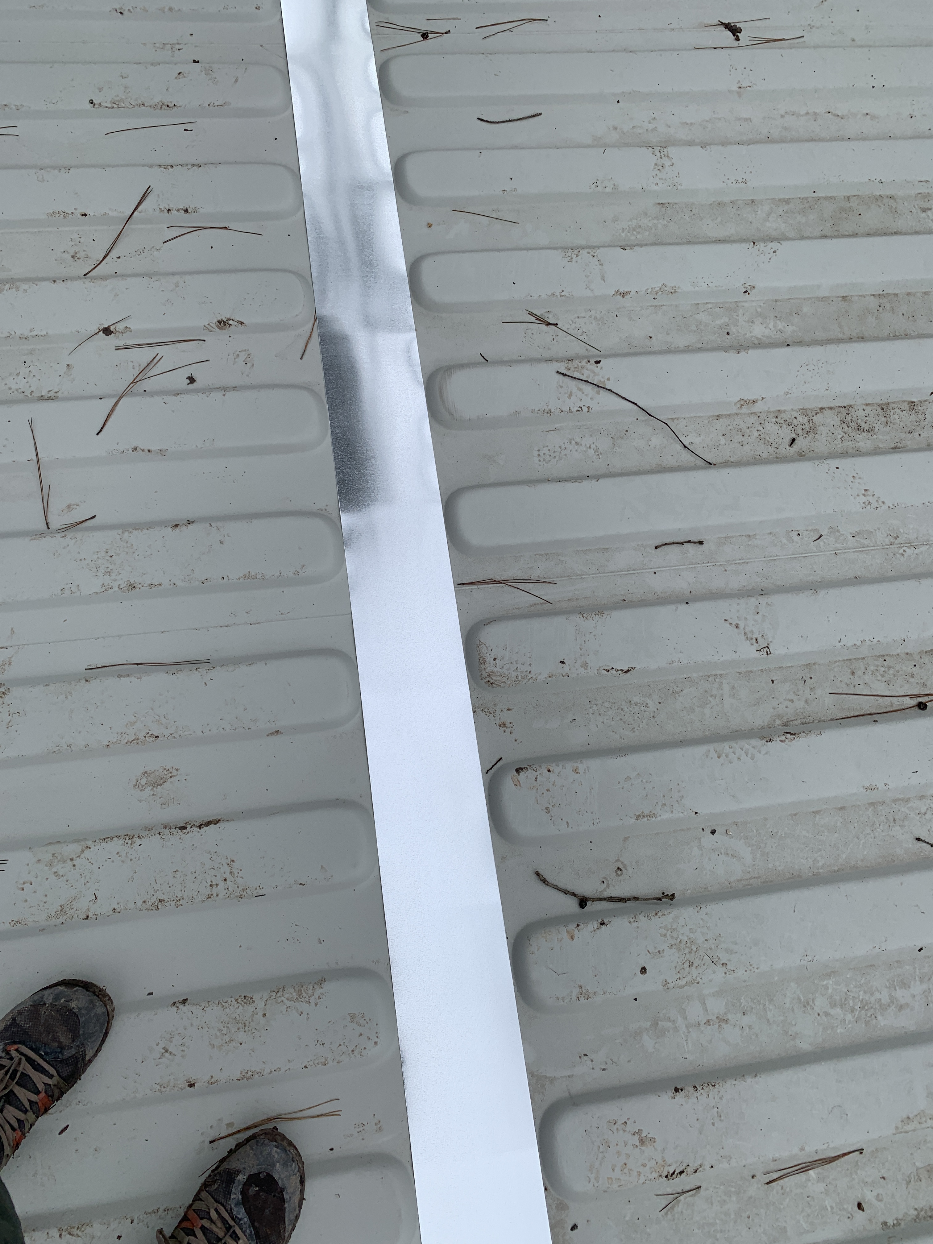 After the containers are clamped to each other and sucked in by wrenching the clamps down, there is not much gap left. Since they are “new” containers, they don’t have much variation or stress added to them that would cause deviations in the gaps either. Therefore I have decided not to weld these together and just weatherproof the seams. I used an expanding foam strip from Frost King that I was able to squish into the gap. It is adhered to one side and then expands out to fill the 1/4″ gap. That alone would probably be enough. But I added more. I went over that with expanded foam gap filler. This added another layer of waterproofing and also created a barrier between the containers so that water can’t flow between the roofs. Everything must be very level because after days of rain, the roofs of the containers were all but void of any water pooling. That allowed me to do this work right after the rain stopped. Then on top of the two layers of gap filler is flashing, roof sealant, roof seam fabric, and then will be a roof coating. I would be very surprised if water could possibly penetrate the seams after all of that. And it was simpler than welding metal strapping down the length of the seams, like on the Houston house. But the whole structure will eventually be covered by an awning roof, so there’s that too. I ran out of screws for the flashing, so the remainder of that, the seam tape, and the roof coating will have to be done this weekend. At least I can expect no more rain inside, even in its current state.