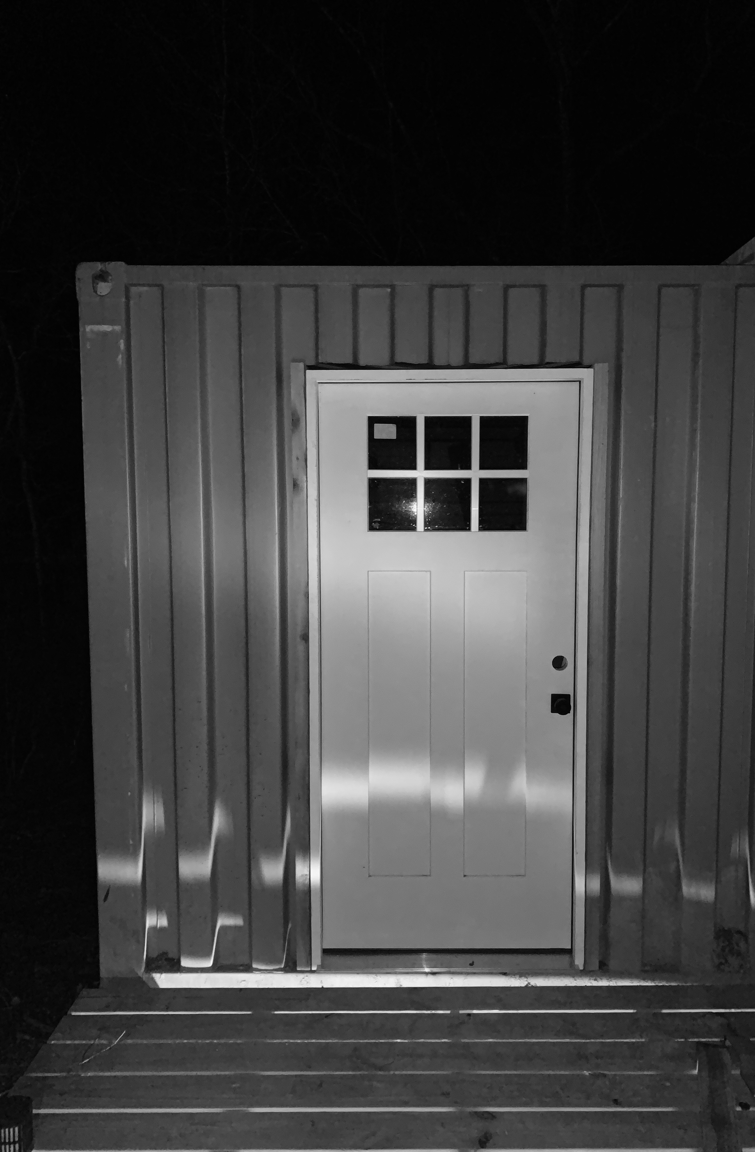 Because half of the weekend was basically rained out, I had to do basic weatherproofing first. I then was able to move onto something that will make access much easier – the front door. As it was, I would have to crawl up a 15′ ladder to get into the first floor through the patio doors. That got old fast. So even though the sun was setting on Sunday, it was important enough that I get the front door in for the next weekend, so I started anyway. Using the plasma cutter (for the first time on 240V), it sliced through the end wall with ease…almost too easily. I had used it before but was limited to 110V that time. It certainly worked, but was slower. This time, it cut as fast as I moved. I keep seeing container modification videos with people using grinders and reciprocating saws. I can’t imagine why anyone doing one or more openings doesn’t drop a few hundred on a Jegs Cut 40 plasma cutter and literally cut their time in half. I got the rough opening cut, basic framing in place, and the door mounted in about two hours. I need to weld in the drip edge at the top, tweak the alignment a bit, install the deadbolt, and seal it. But the bulk of the work is done and it is secure, so access will be easier next time. I am not as worried about heavy duty framing for this opening because it is on an end wall, which has relatively little space to the corner posts. Plus there is no container on top of this one. The structural engineer advised me on the last project that an opening in a container, with no other container stacked on top, only needs wood framing. It was dark by the time I wrapped up, so the picture sucks, but I will eventually post another completed view.