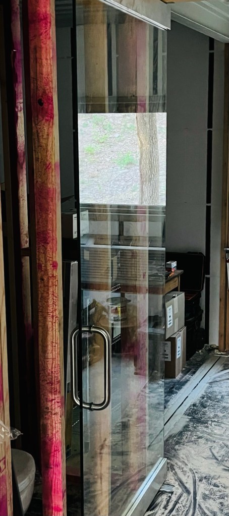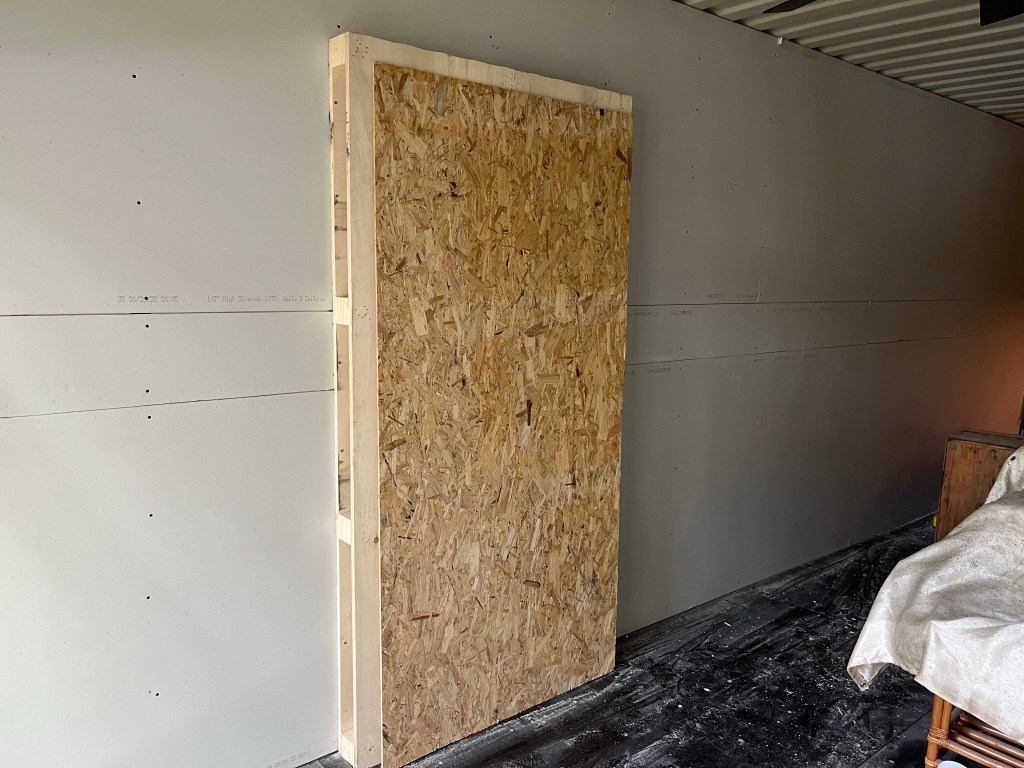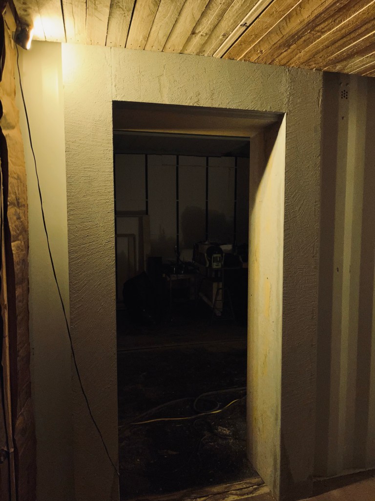 I have been upcycling many items to use in this project. Two demo door frames taken out of a showroom frame the entrance into the living room from the entry. I used pallets to make the ceiling to cover the dents from the damage. I also recycled a commercial glass storefront door that was replaced in a showroom. It had too much of a gap at the bottom to be a great exterior door, but it works well as an interior door to cut down on some noise, add security (it has a lock on it), and still have natural light. I have plenty of other repurposed items in use. I may make a separate post just to showcase some of the reuse cases.