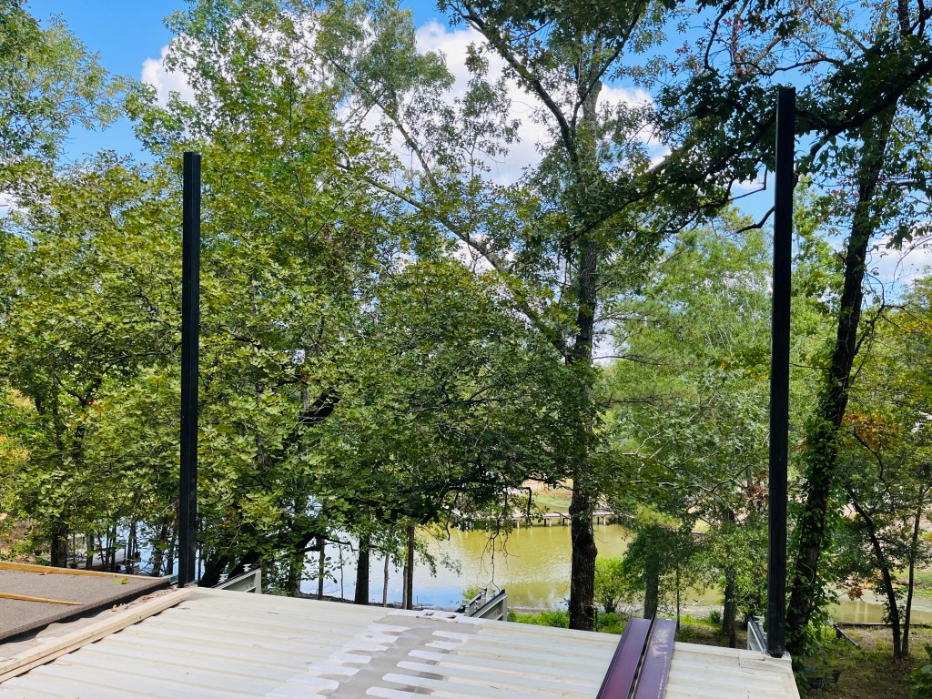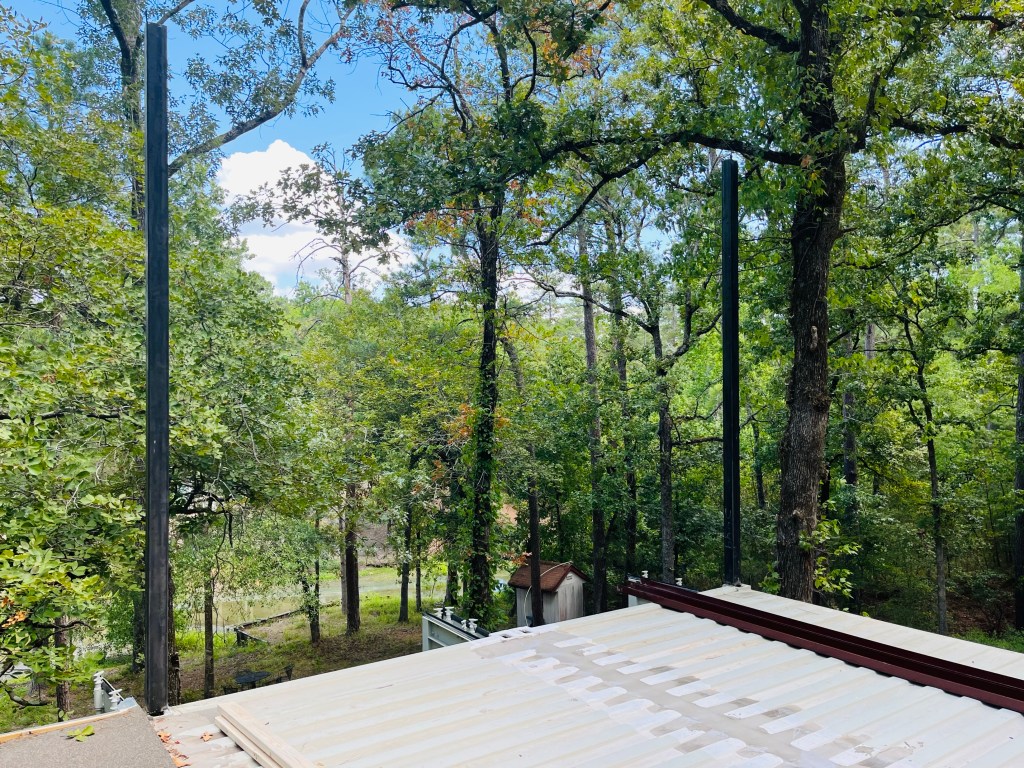 Before the rush to complete interior work because of drywall occurred, I naively thought I could get the supplies for the roof structure and get them in place quickly. I did get the main uprights in place. It was one of the more challenging items, since these were 12′ tall steel 4×4″ posts that I had to set and weld down at the same time. I somehow managed to get them level and secured by myself. I also got the roof structure over the second floor assembled. I can’t finish securing it down until the other part is complete because they have to marry in the middle. It was too hot and I was too tired to finish that project in one weekend. I didn’t want to fall from 30′ up while I was trying to secure 20′ purlins, so I stopped at this point.
