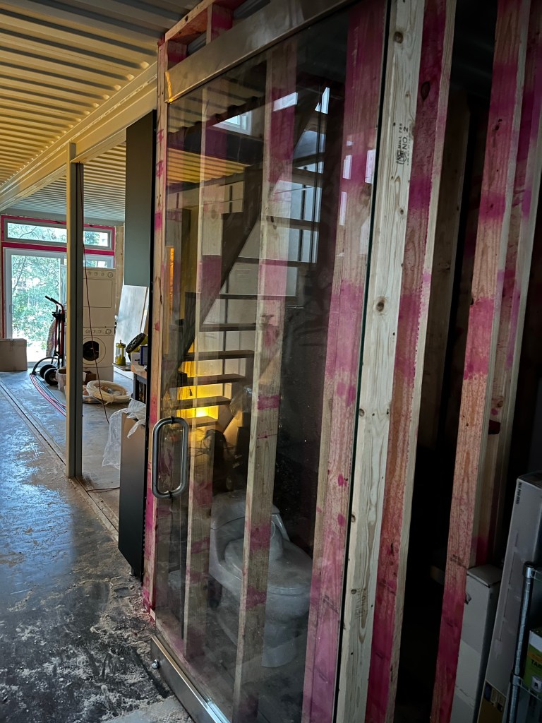 Both showers are in and functional. I used an exterior door for the upstairs “master suite” because Home Depot had some on clearance that were cheaper and better than a similarly priced interior door. I decided to frame out a drop down in the first floor bedroom which will conceal the plumbing from the upper floor and provide a nice accent for reading pendants to hang from. I did very little electrical behind the styrofoam insulation. There are channels built into it, but after looking it over, I decided I liked the somewhat industrial aesthetic of having exposed wiring / conduit and surface mounted J boxes in some areas.