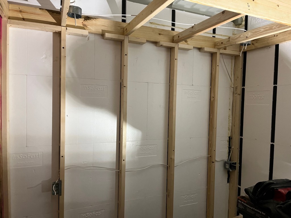 As I mentioned, I did not take many pics of electrical and plumbing, as they were fairly standard. The bedroom walls were two of the only areas where I used standard Romex. I did use predominantly MC armored cable for the electrical. That way if I am running it out of the house, in a tight spot, or in a weird way where I can’t put a nail plate; I won’t have to worry about it. I am looking forward to getting the lighting installed but I have to wait until drywall is complete. I was not impressed with the crew that was hired to hang the drywall. I had to fix many things, add more screws to secure panels, and mark lots of mistakes. I really hope they fix everything during float / tape because otherwise, it will look like crap. I understand that this was probably the first time they had worked with styrofoam panels that had integrated plastic studs. These studs are also 20″ on center but the walls are much flatter as a result and don’t need to be spaced as close, versus using standard wooden studs. We will see what the end result is like after this week.