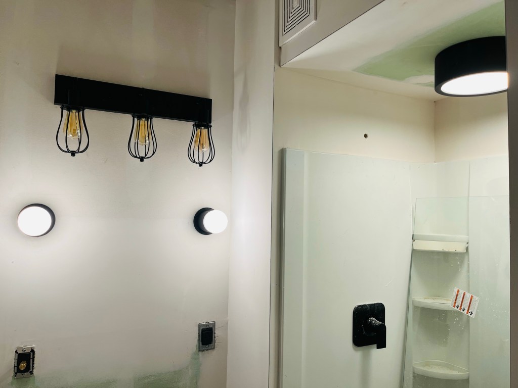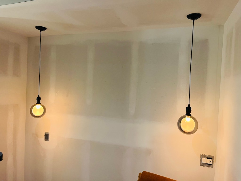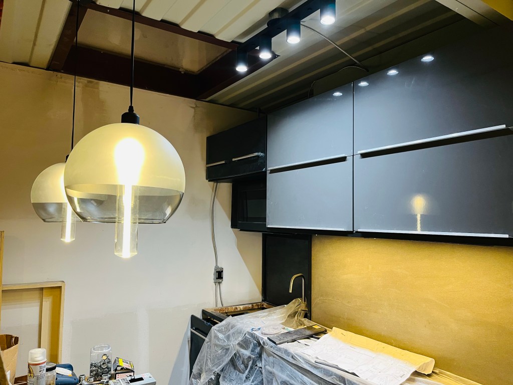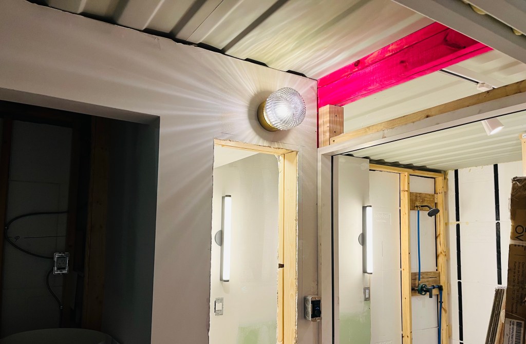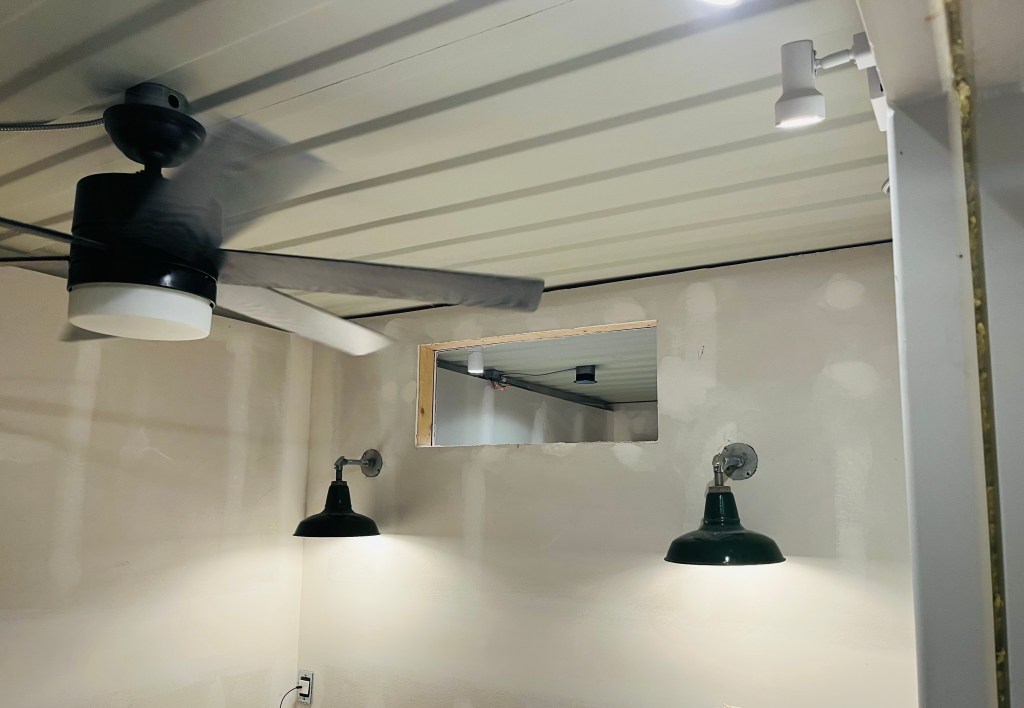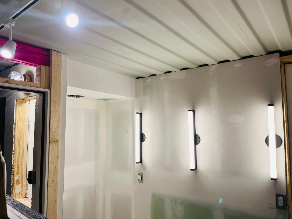 In many of the areas, the lighting was installed on the wall or in a drop down created for another purpose. For those, the installation was standard. The repurposed slat ceiling in the entry was used to cover the mangled container ceiling from the mishap. The first floor bedroom pendants were installed in the dropdown over the bed which was created for the plumbing. I repurposed a high end decorative fixture in the hall between the kitchen and downstairs bedroom. It was damaged in a remodel but functionally, it works fine. I plan on making a cover for it. The upstairs bedroom sconces came from an ocean faring ship, but don’t know the history other than that.