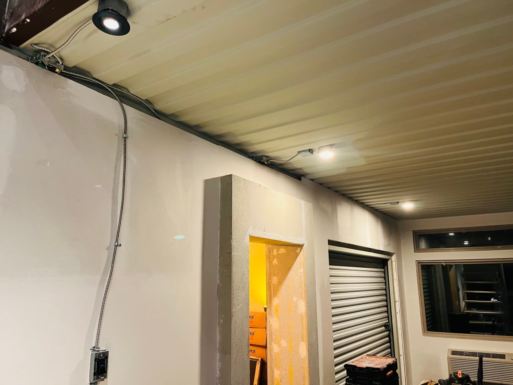 I have been getting electrical set up in phases for quite a few months, starting with the HVAC and moving on from there. There is one decorative fixture that I added, which still needs wiring to it, but otherwise all of the electrical is completed and tested now. I used almost all 12ga wire, with the exception of a handful of low wattage light fixtures. It is almost all armored cable so that it can go under the house or be left exposed. So all in all, the house is really overwired – more like a commercial building. The armored cable will be left exposed in some places, along with surface mount metal J boxes, to give it a light industrial feel that will come together more after paint.
