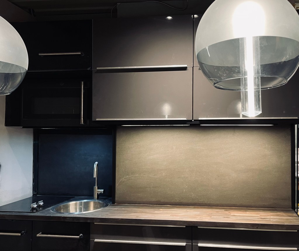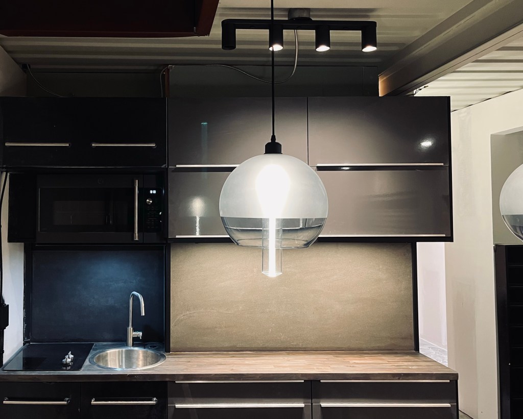 I also completely finished the kitchen. Everything works, which is no small feat considering that the tankless water heater, stovetop, microwave / oven combo, garbage disposal, sink, and lighting are all part of a kitchen like this. I damaged the butcher block countertop at the sink a while back when I was cutting out and trimming what I call the skylight. It is an opening to the second floor, right in front of a glass door, so it gets a good amount of natural light. I let a large piece of metal slip while working on it and that gashed the countertop along the edge. I have since repaired that, so I just need to stain and seal it to finish it off. Other than a faulty light bulb that needed replacing, that completes the kitchen. Having a working kitchen is always at the top of the list for any build, so it is a relief to have that all working.