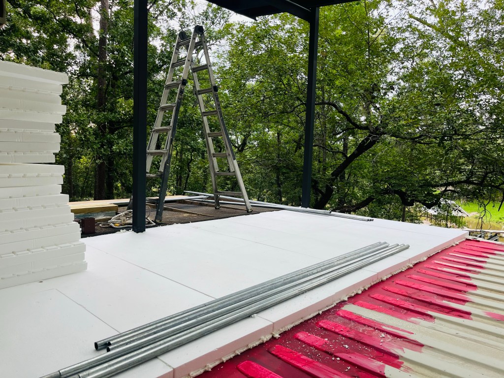 I bounced around several ideas, including joists with traditional insulation, concrete (including aircrete), and a few other options. I stumbled across an idea and after doing the math and researching, I landed on high density styrofoam. The type I purchased was rated at an R10. When you add some foam to the corrugation as gap filler, additional insulation, and adhesive for the polystyrene; I figured the end result would be between R12-15. Coupled with the solar roof over the deck, I was hoping it would have a substantial effect as the outdoor temps rise.