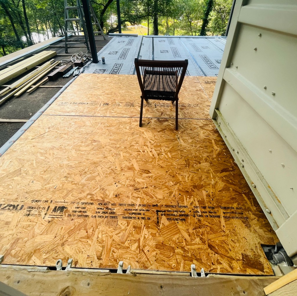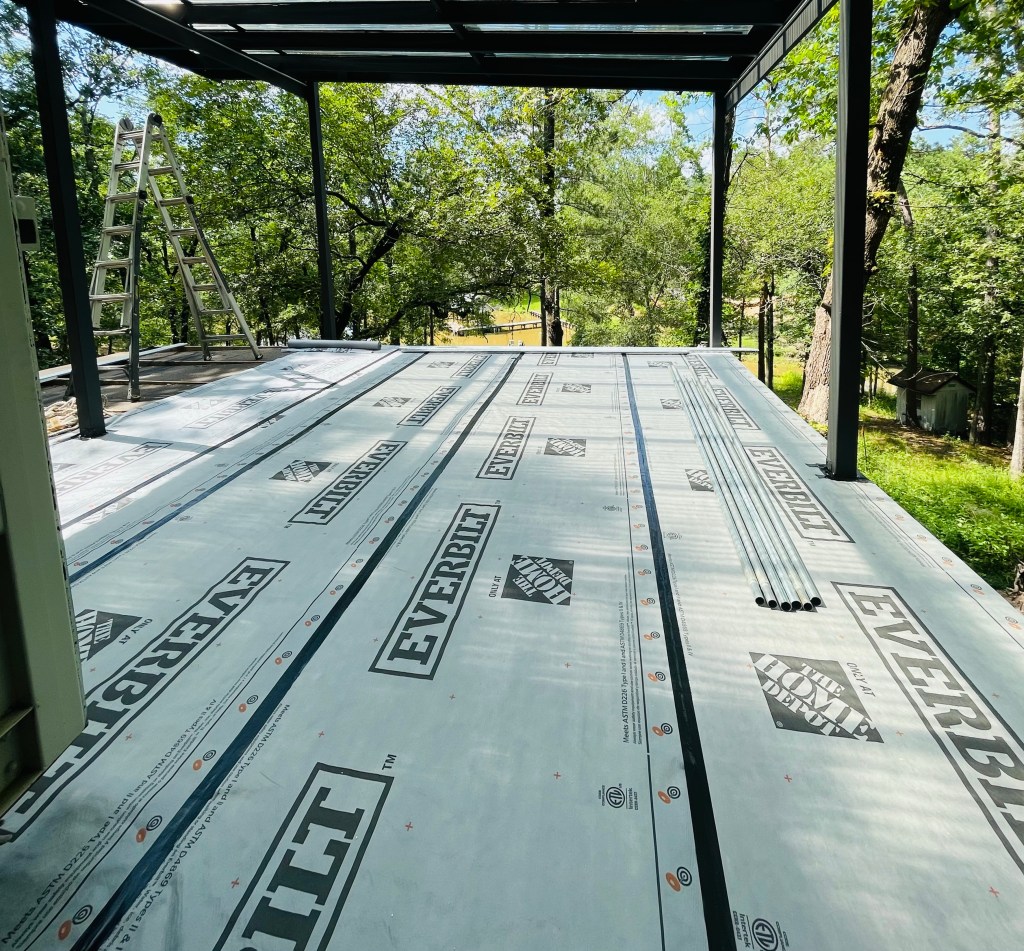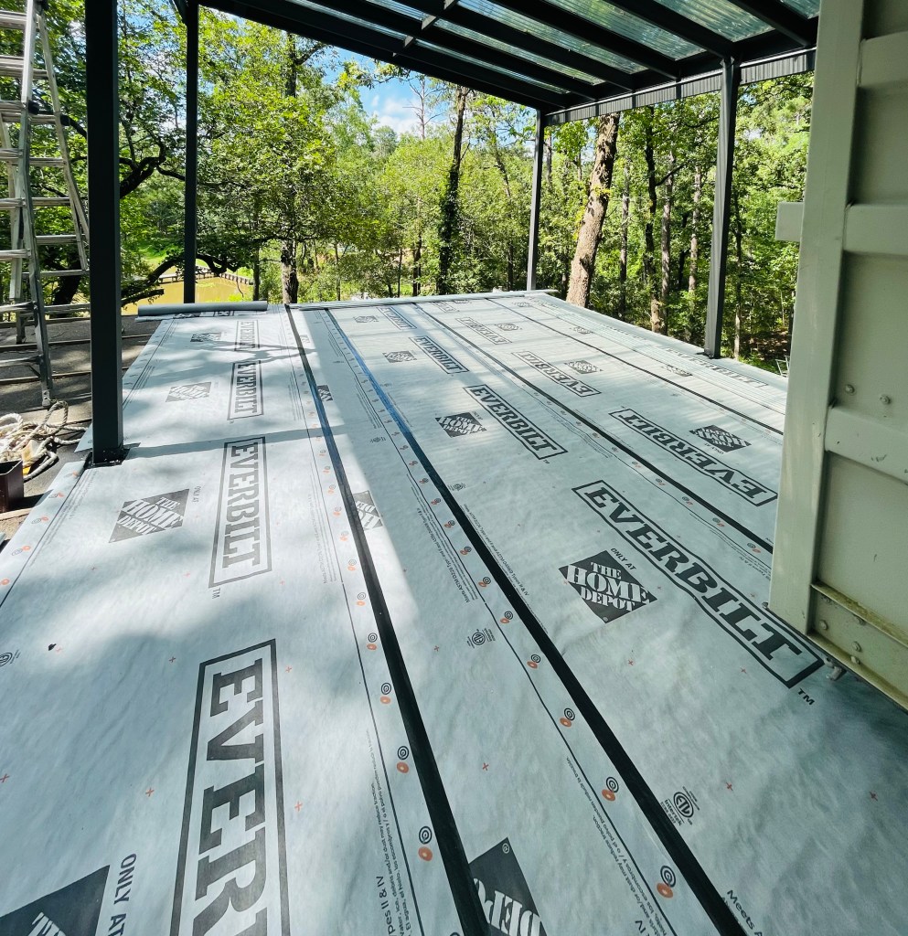 Even though it has a high water resistance rating, the roof was already watertight underneath, and I put an extra layer of RedGuard for extra protection; I decided another layer of protection wasn’t a bad idea. I added a layer of synthetic roof underlayment over it. It was cheap, extra insurance. The day after getting the insulation and foam onto the metal container roof, the indoor temps were were they should be. It got to almost 100 degrees with a heat index of 106 outside and the living room HVAC (the room under the deck) didn’t even kick on until almost noon. Easily a 15° improvement. Eureka.