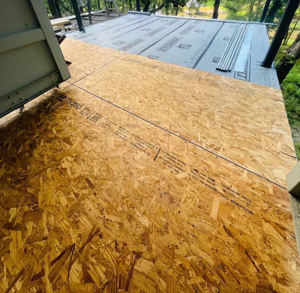 After laying the underlayment and taping the seams, I added flashing around all sides. I then tested my theory on the next layer. That part is tongue & groove roof decking material or sheathing. I only got four sheets because the night I was picking it up, it started storming – badly. I was fortunate to get materials loaded up and make it back in one piece. The wind was so strong that it required driving at under 55mph instead of the usual 70mph. The wind did pick up one piece of roofing panel that was only partially attached due to the need for a taller ladder to reach the last securing points. But rain or not, I got up there and straightened it out after the wind died down. I waited until morning to try the decking with the t&g. It worked well.