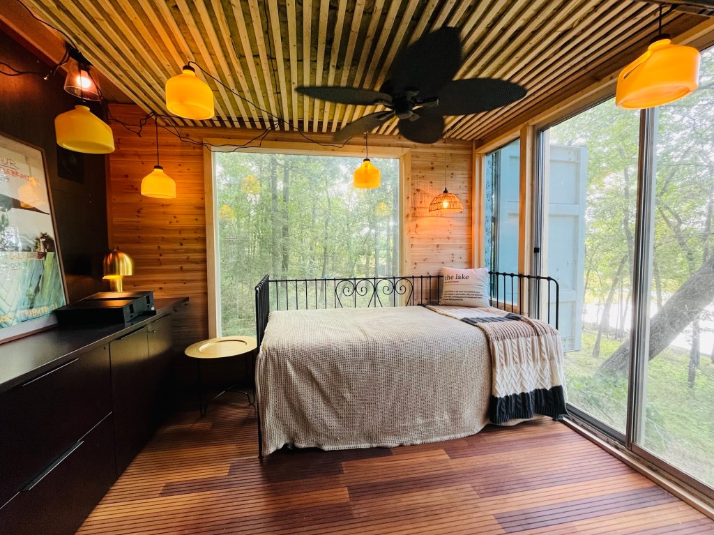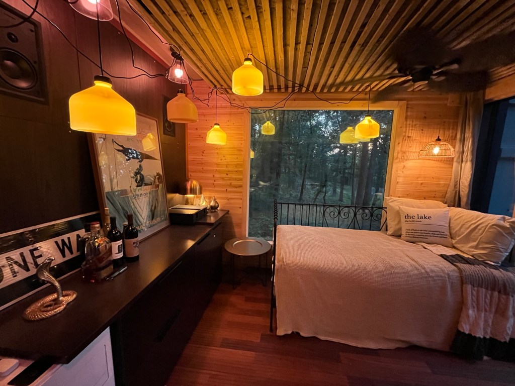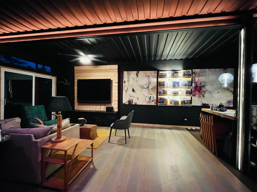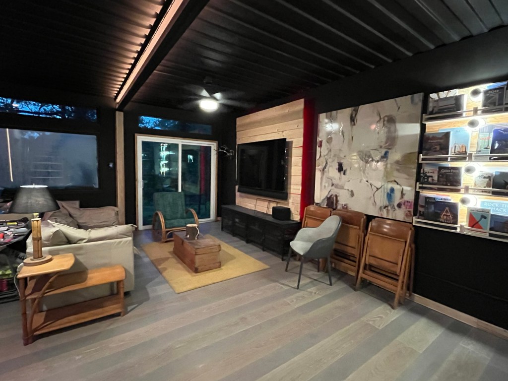 With the window installed, I added insulation and decided on cedar planks instead of drywall. It goes well with the teak floor. I swapped the beds around and it allowed me to go back to a queen sized bed in the bedroom and use the daybed in the bar. It kept an open feel but gives another bed(s) for guests. I used a slat ceiling, which I’ve done several times in the past. I wanted a bayou vibe and I think that was successfully achieved, especially with the Rauschenberg in play.