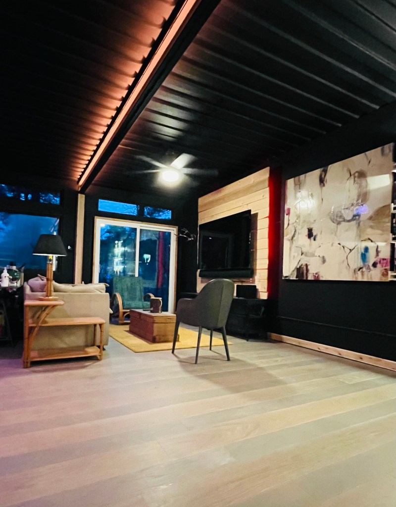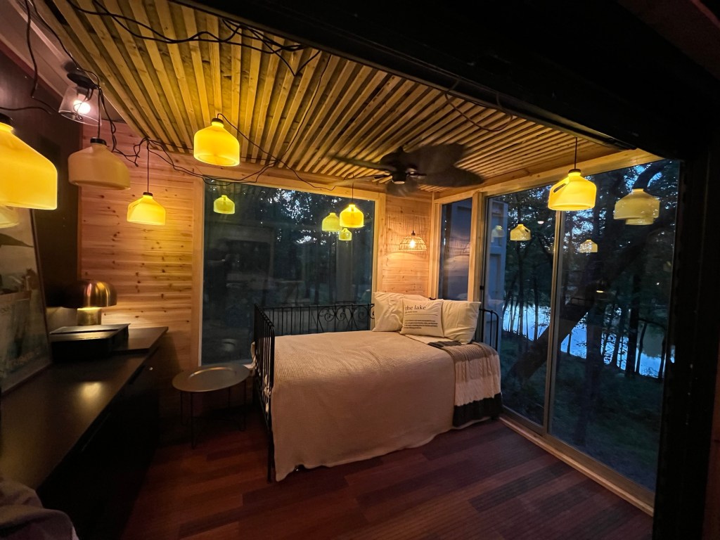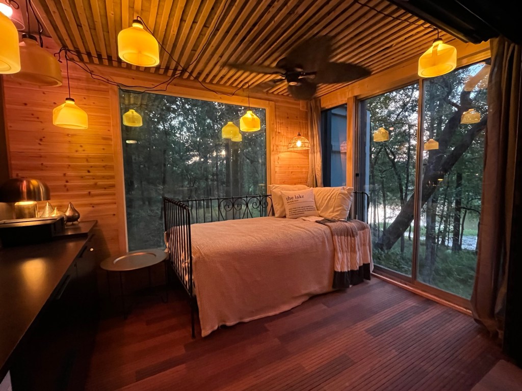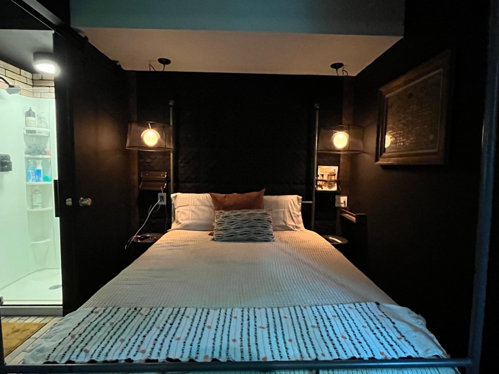 With the window installed, I added insulation and decided on cedar planks instead of drywall. It goes well with the teak floor. I swapped the beds around and it allowed me to go back to a queen sized bed in the bedroom and use the daybed in the bar. It kept an open feel but gives another bed(s) for guests. I used a slat ceiling, which I’ve done several times in the past. I wanted a bayou vibe and I think that was successfully achieved, especially with the Rauschenberg in play.