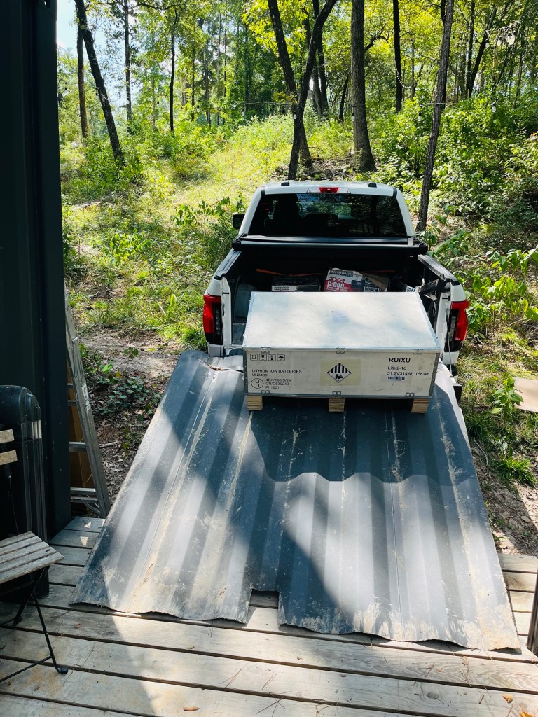 So what’s next? Well, I am installing an inverter, battery, and some solar. I have this at the Houston house and it makes a big difference. I’m never without power. I have some of the components but still need the panels. It’ll take several hours to wire up and get working. I got the arguably hardest part completed today: the battery delivered and in place. This may not seem like much, but these are 300lbs+ units and not easy to manage down the slope, especially by one person. But it ended well. Ready for wiring.