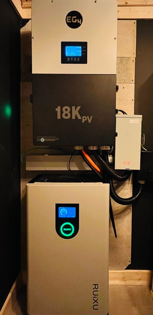 I used Sol-Ark / Homegrid in Houston and it is integrated with my Savant home control system. As much as I like it, I wanted to try another, lesser expensive option for the lake house. I chose EG4 with a Ruixu battery. I got the battery in August, but couldn’t install the system without the missing bracket for the inverter. Unfortunately it took from September to January before Signature Solar got me the bracket. Once I could mount the inverter, I could then wire it all up. I design and sell these types of systems in my day job, so I am reasonably familiar with them. I like to include a manual transfer switch so that the inverter can be serviced or replaced while still providing grid power to the house.