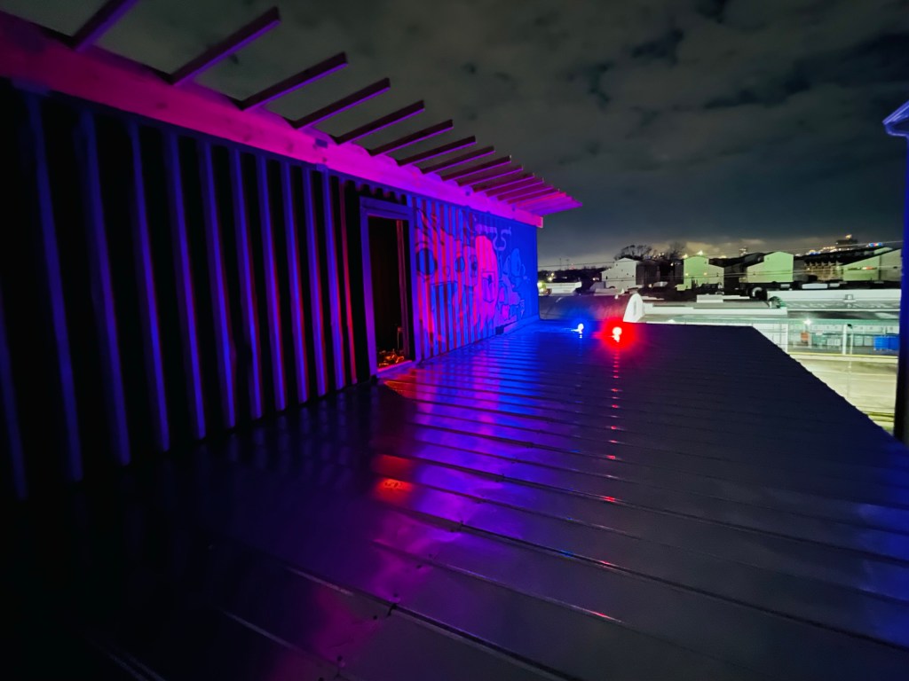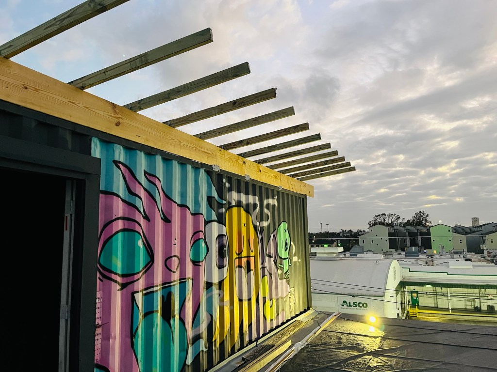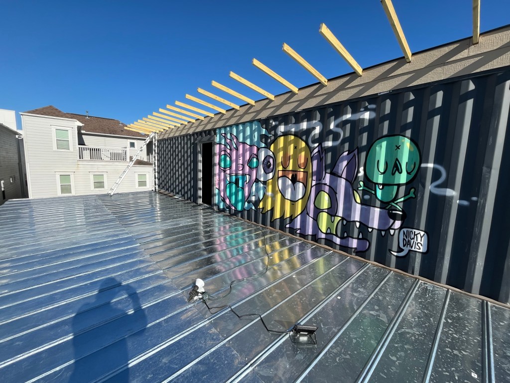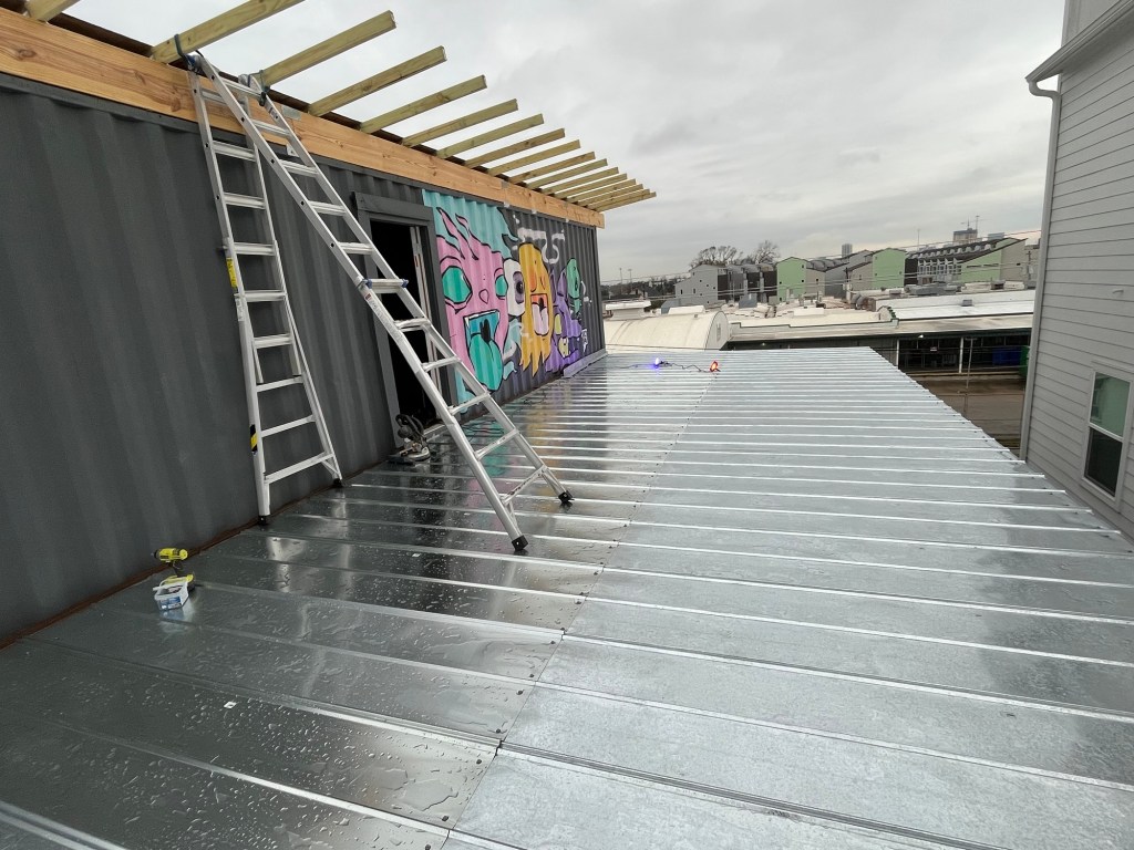 However, I was more motivated to replace the roof when I started planning for solar panels on the top container roof. I have to have a ladder on the larger section to get up to the highest section. Soft spots in the roof become a little more concerning when the ladder starts to find them. I bit the bullet and put metal roofing on everything. That required that I replace the decking. The decking was the only thing that I did not carry up 3 flights of stairs by myself. Solar panels and metal roof panels – yes, believe it or not. I installed everything on my own too. Roofing with these methods is not that difficult for one person to do if you don’t have a major pitch to deal with. This was the reason I made the main section walk out, so I could service it myself in the future.