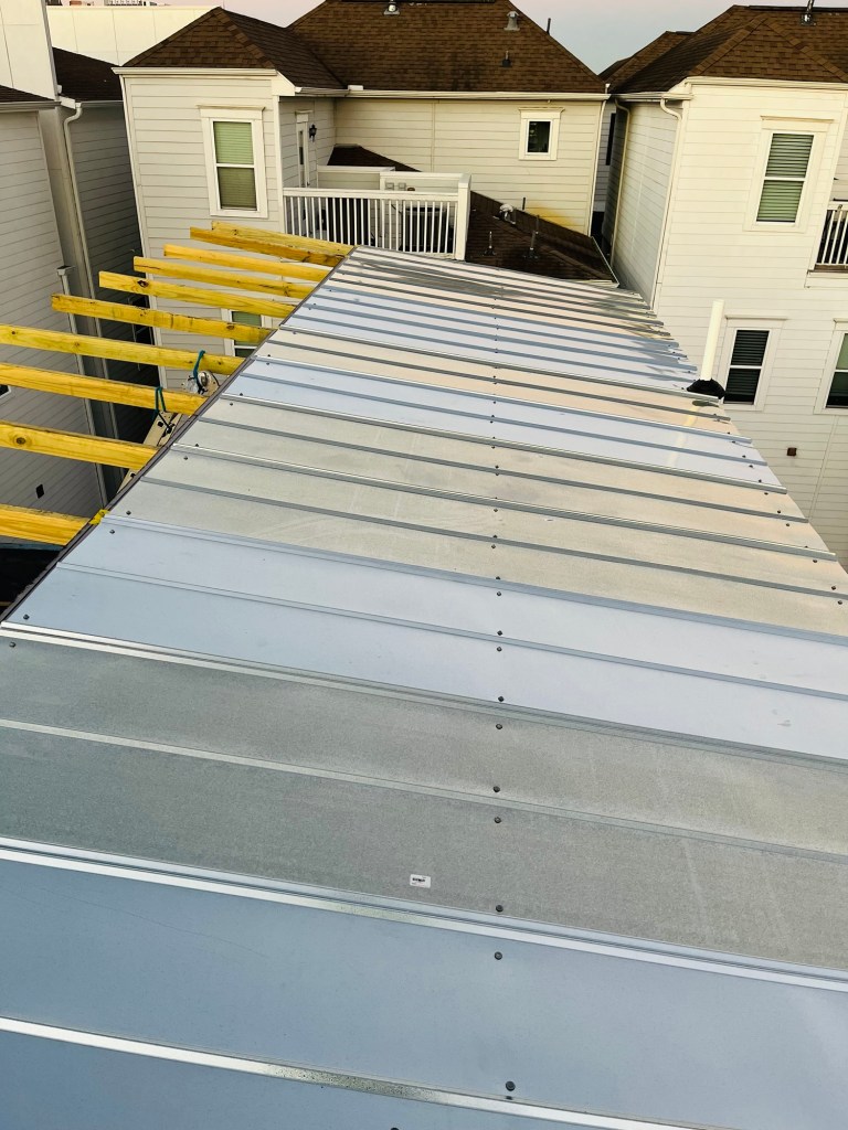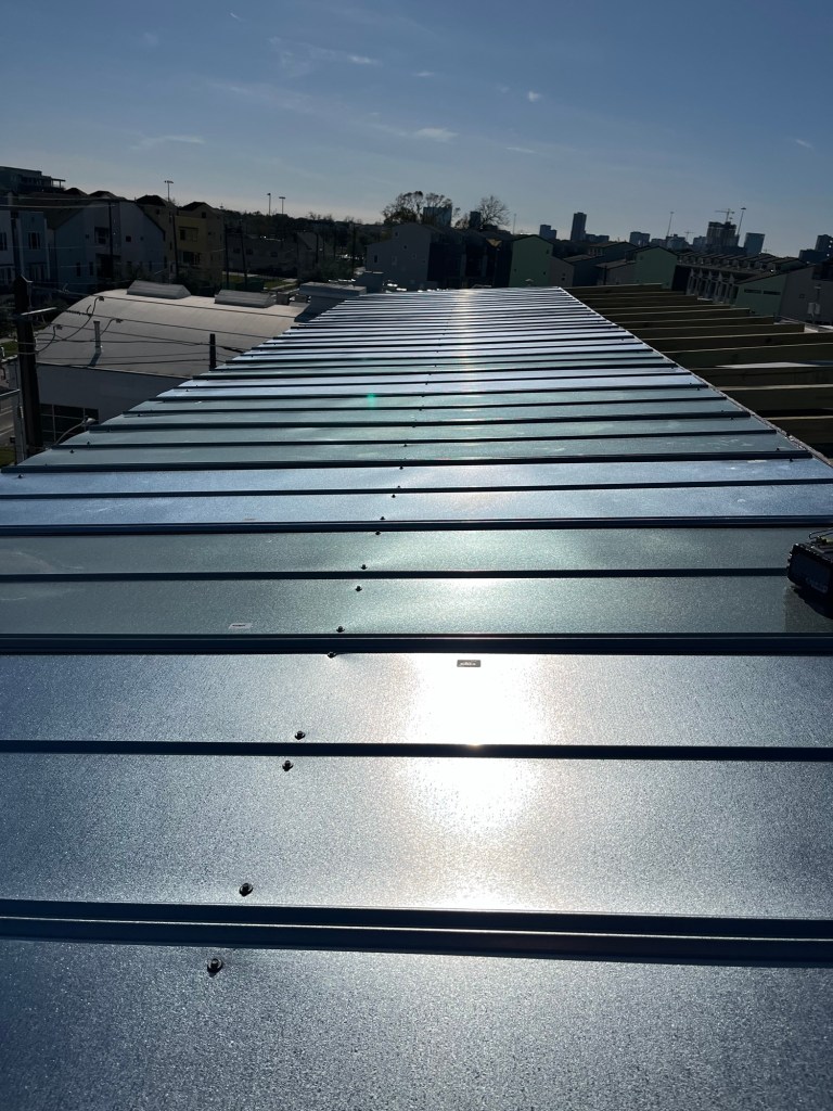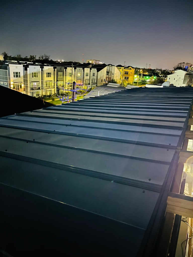 While I was at it, I went ahead and added some purlin extensions to the uppermost roof so it can hold another row of solar panels. Reroofing does not require a permit in Houston, but I will have to get a permit to put the solar panels into service. As it stands, I have both areas of roof (upper and lower) completely finished. I am ready to install the solar panels on the top section. I should be able to produce 8-9000 watts with the panel array I have planned. It should be more than enough to run my house and charge the batteries. My hope is that I never have to do any maintenance to the roofing now that the metal is down. Maybe one day, I will build a deck up there.